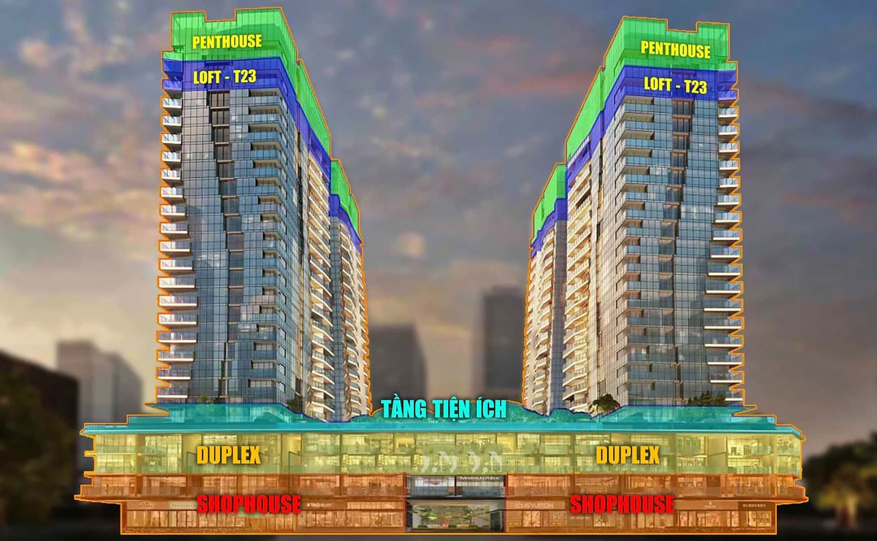 | Các loại hình sản phẩm | Shophouse: 38 căn, 117 – 500 m² • 1PN: 54 m² • 2PN: 69 – 77 – 83 m² • 3PN – 2WC: 137 m² (thang máy riêng) • 4PN – 3WC: 179 m² (thang máy riêng) • Duplex: 231 – 282 m² • Loft: 92 – 265 m² • Penthouse: 170 – 380 m² (chưa tính sân vườn) |