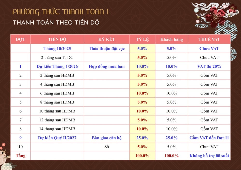 - Thanh toán bằng vốn tự có chỉ từ 15% khi ký hợp đồng