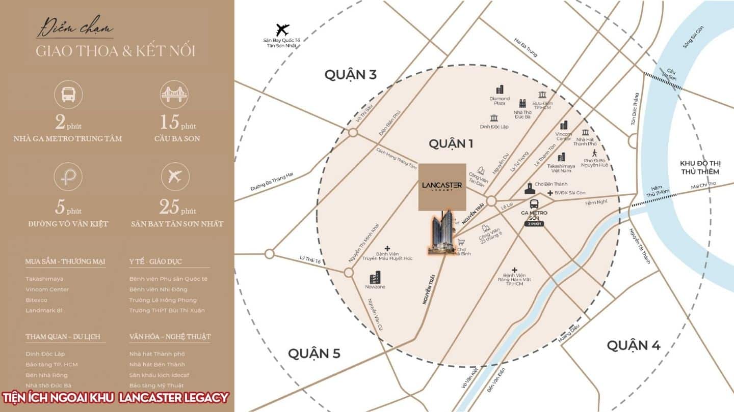 Sở hữu mặt tiền ngay trục Nguyễn Trãi – tuyến đường luôn sầm uất và kết nối trực tiếp nhiều trung tâm dịch vụ – Lancaster Legacy trở thành điểm đến lý tưởng cho những ai muốn sống giữa nhịp sống năng động của thành phố. Dự án thuộc Quận 1 nên cư dân gần như không gặp bất kỳ rào cản nào trong quá trình di chuyển hằng ngày.