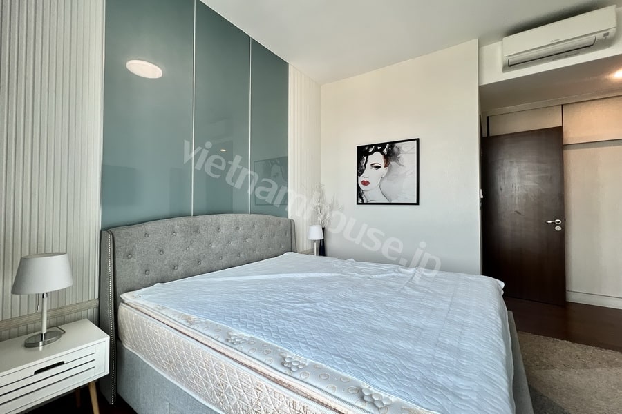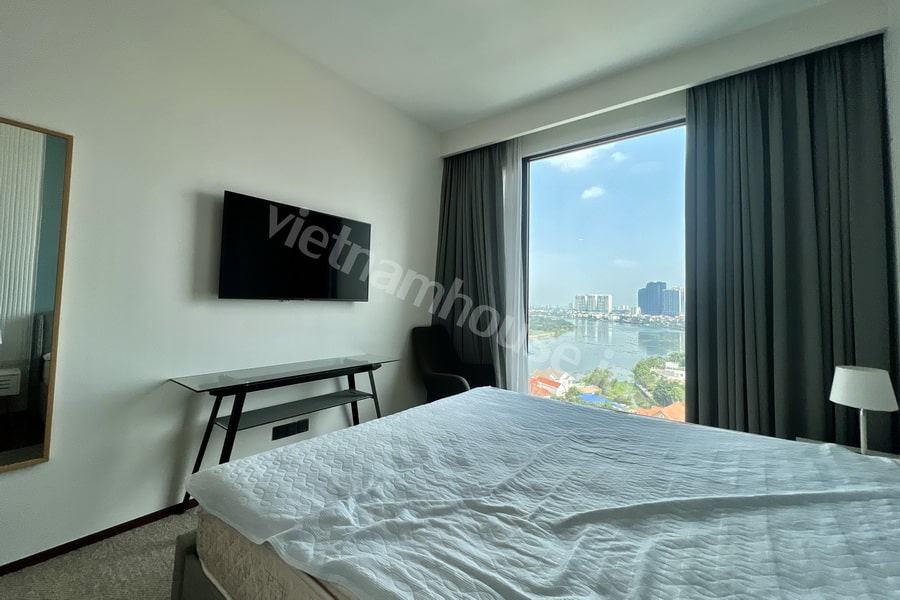 Căn hộ rộng 140m², bố trí 3 phòng ngủ – 2 WC, phòng khách rộng thoáng, ban công hướng sông đón gió tự nhiên. Nội thất được trang bị đầy đủ: sofa, bàn ăn, tủ âm tường, bếp hiện đại, máy lạnh, máy giặt, tủ lạnh… Tất cả đều trong tình trạng mới, chỉ cần xách vali vào ở.