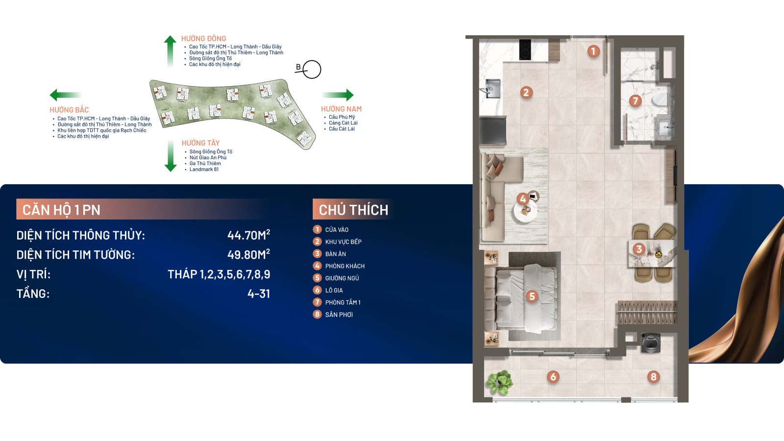1 phòng ngủ 49.8 m² 7 – 7.8 tỷ/căn