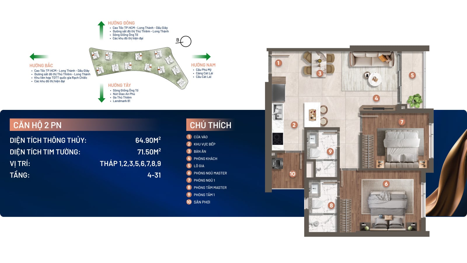 2 phòng ngủ 71.5 – 88.7 m² 9.5 – 13 tỷ/căn