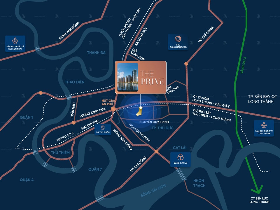 The Prive là dự án căn hộ cao cấp do Đất Xanh phát triển tại khu đô thị Nam Rạch Chiếc, phường An Phú, TP. Thủ Đức. Quy mô 6,7 ha gồm 12 tháp 33–34 tầng, tổng cộng 3.175 căn từ 1–3 phòng ngủ. Sở hữu ba mặt giáp sông Giồng Ông Tố, dự án tạo nên môi trường sống riêng tư, thoáng đãng và giá trị an cư bền vững.